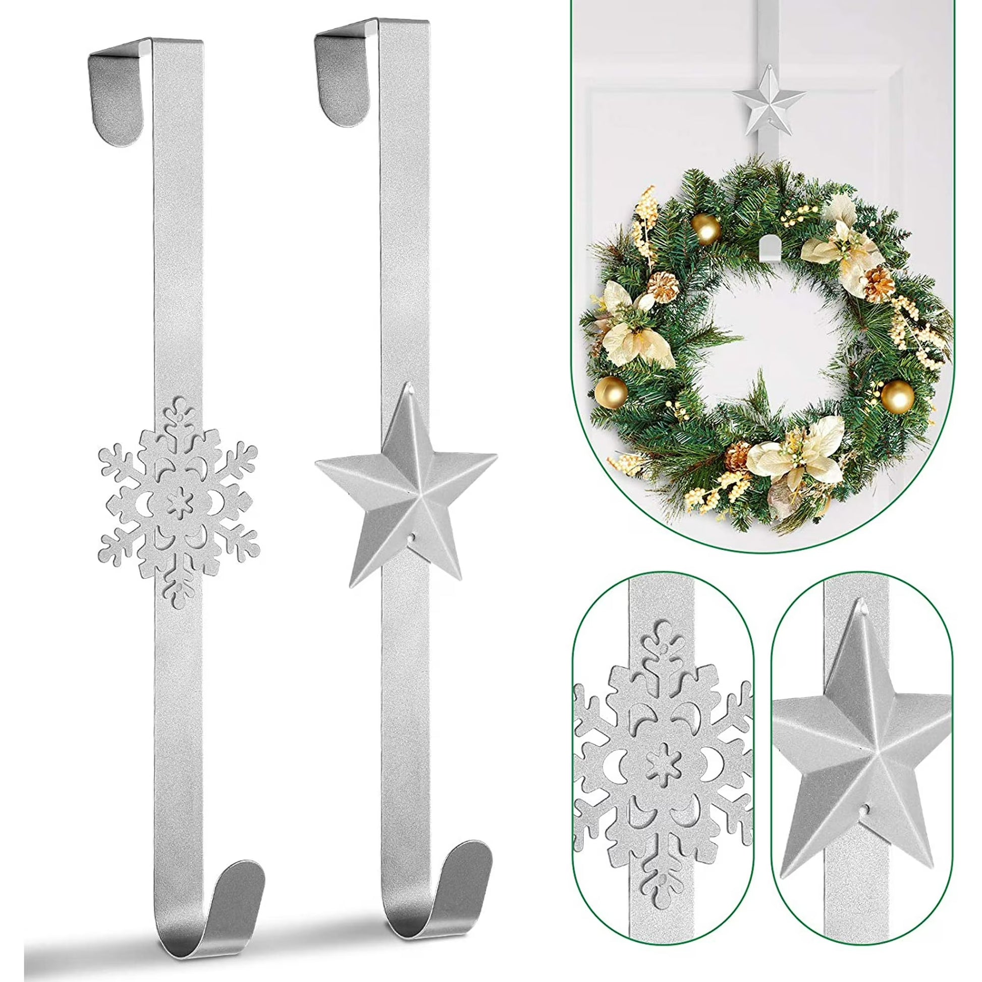- Festive Wreath Hangers: Set of 2 star-shaped hooks for Christmas wreaths and garlands.